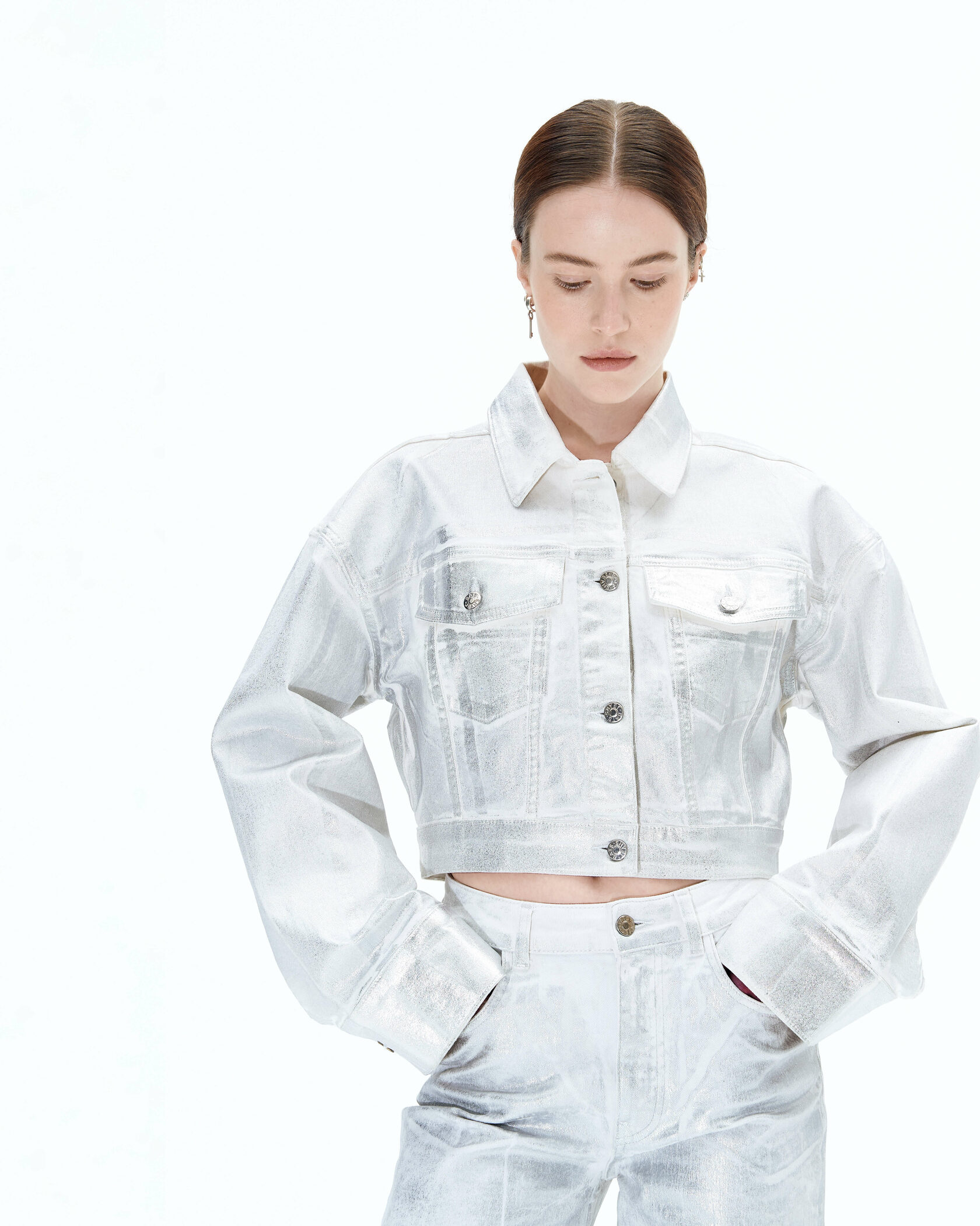 Укороченная куртка из Денима изготовлена из 100% мягкого хлопка. Джинсовые пуговицы с логотипом бренда и накладные карманы легко дополнили образ.