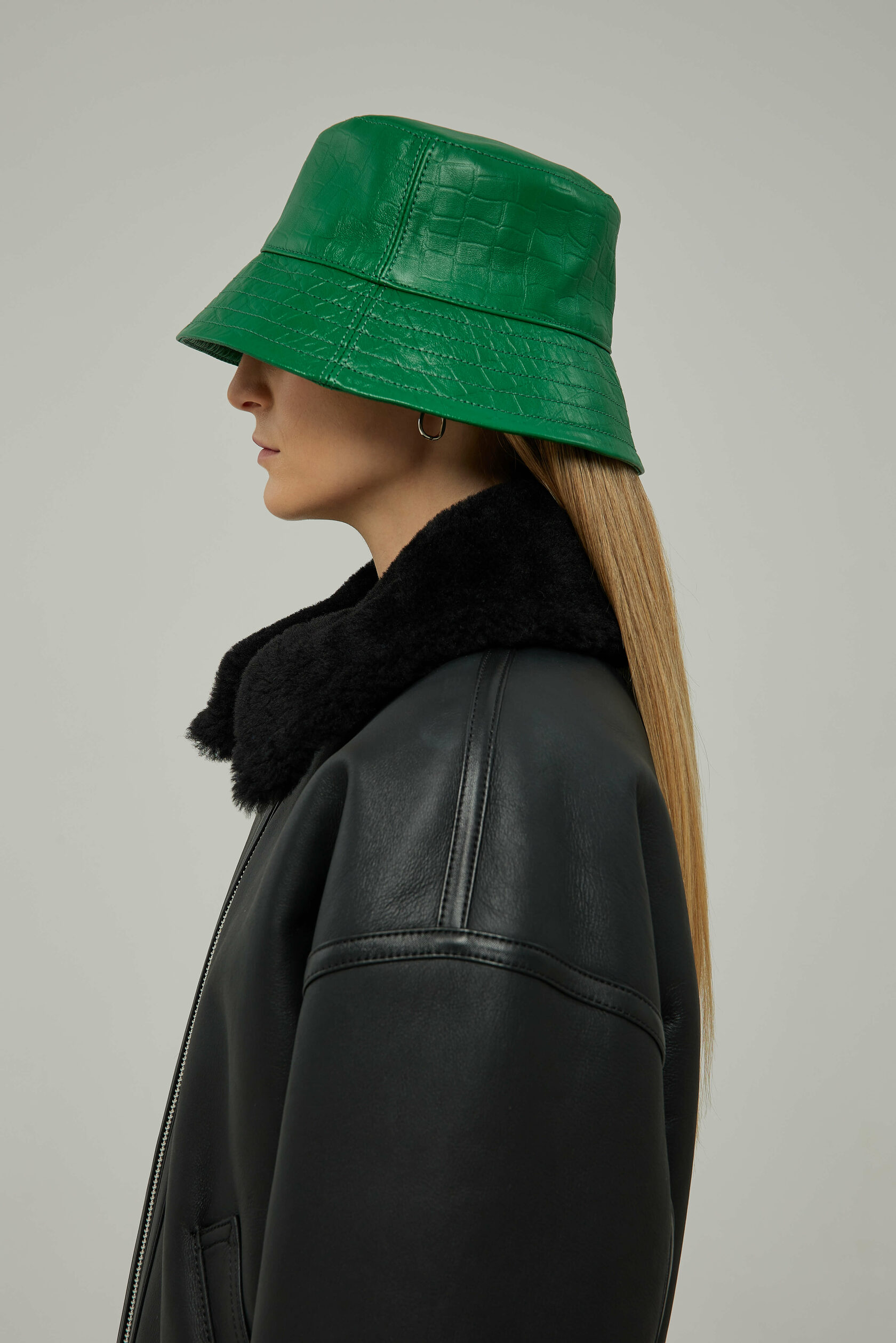 Для пошива этой модели с широкими покатыми полями, простеганными нитью в тон, мы использовали мягкую кожу с тиснением под крокодила.