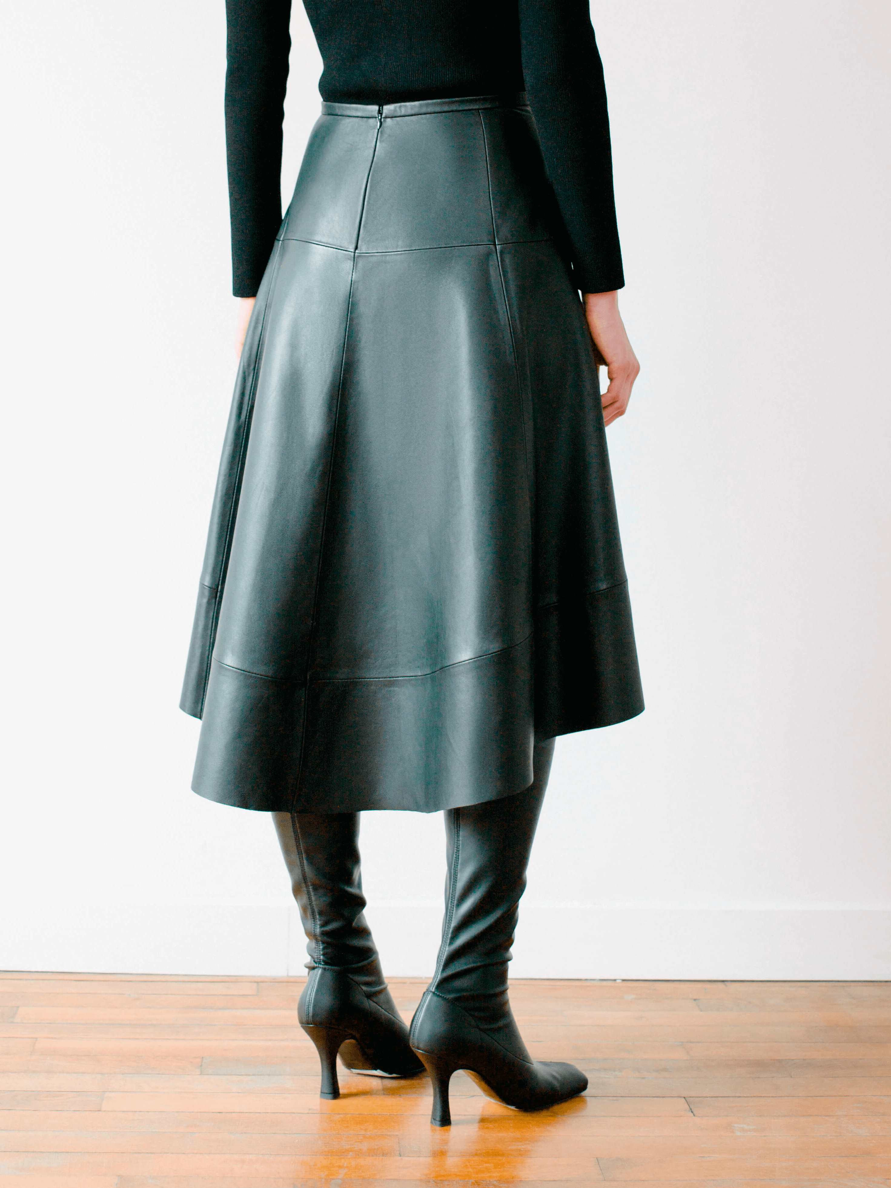 Эта ассиметричная кожаная юбка с мягим силуэтом и кокетливыми складками станет самостоятельной частью вашего гардероба. Она сшита из гладкой мягкой кожи с легким матовым блеском.